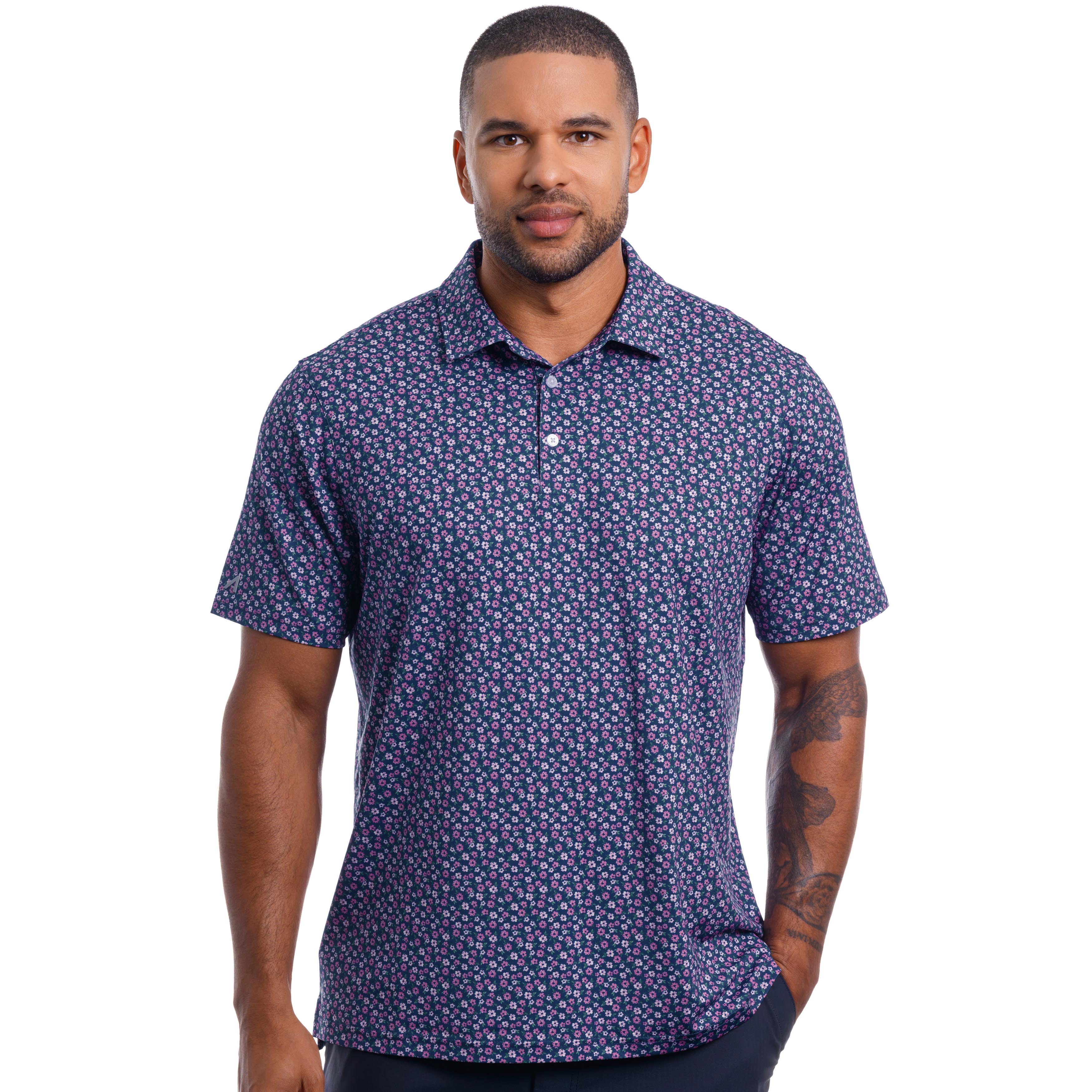 Bold, refined, and effortlessly wearable, the Perfecto Polo showcases this season’s must-have floral in a modern performance silhouette. Featuring an all-over azalea floral print, this men’s polo blends soft pink tones and vibrant fuchsia blossoms grounded in a rich navy motif, creating a striking yet balanced look that stands out on the course and beyond.